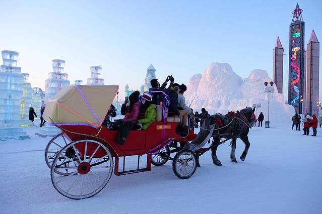 在餐厅小憩过后,继续往下一站。这个餐厅就有导游在拉客,可以直接坐免费的车到冰雪大世界,只要付门票钱就行了。冰雪大世界是哈尔滨最大的冰雕公园,价格也非常贵,330元,网上要提前一天才能订,而且也只便宜20多元,我们也就从了吧。距离倒是不远,一会就到了