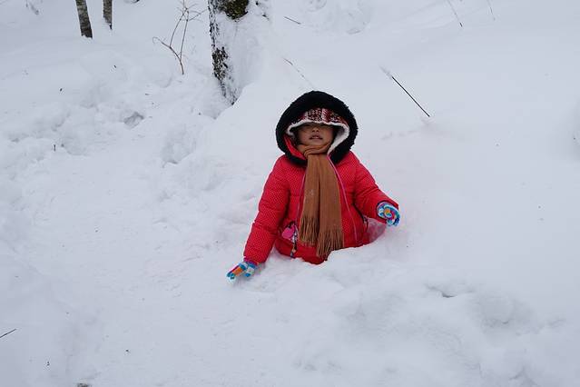 不过要注意的是,这里的雪也很厚哟,只能沿着小路走,如果你不小心踏出路边,看看小豆子,立即半人就不见了。如果你的手机什么的不小心掉雪里,嘿嘿,十有八九看来是找不回来了。