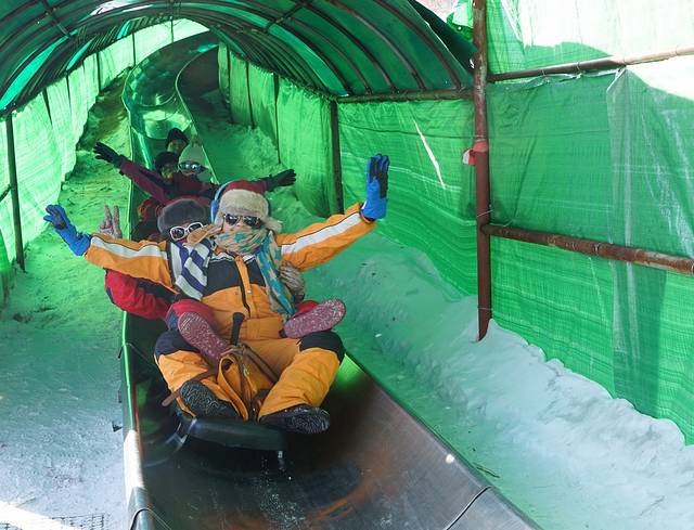 在冰雪大世界里有很多的游乐项目,大多数是大滑道,价格已经包含在门票里,但是排队的人龙太长了,我们真没这个耐心排了。