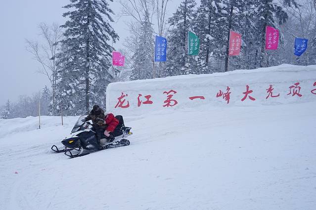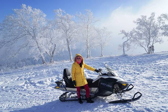 从亚布力到雪乡80多公里,但一路上的景色让人沉醉,首先就是号称龙江第一峰的大秃顶子山。这里的山峰冬天就积着厚厚的雪,它的雪又白又厚,就象是棉被一样,十分难得。从山下上到山顶需要坐雪上摩托。