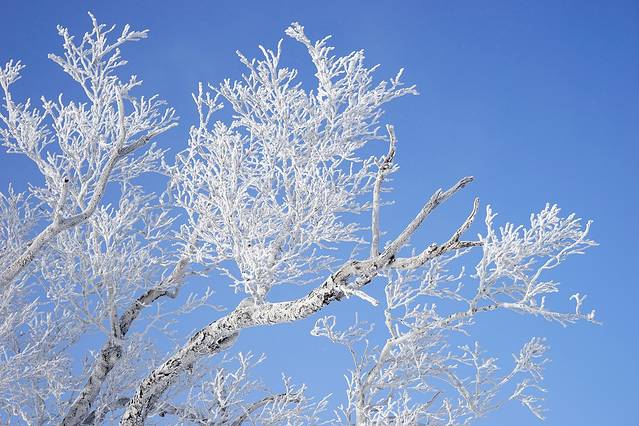 树枝都被雪染成了银色,就象是冰做出来的一样,就这样挂在蓝天之中