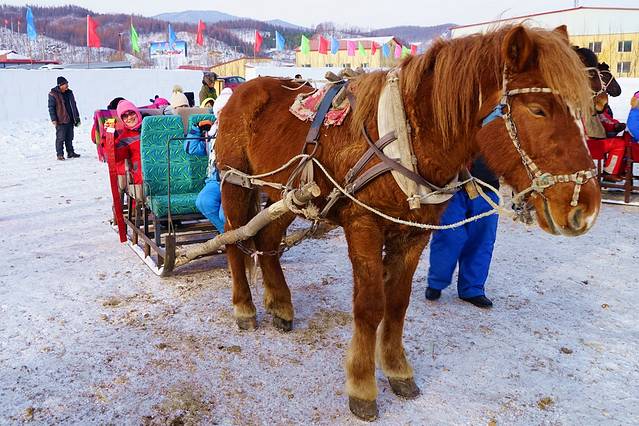 然后来个寻常项目,马拉雪橇,这个在亚布力周边有很多。项目基本相同的。六个人一辆马车