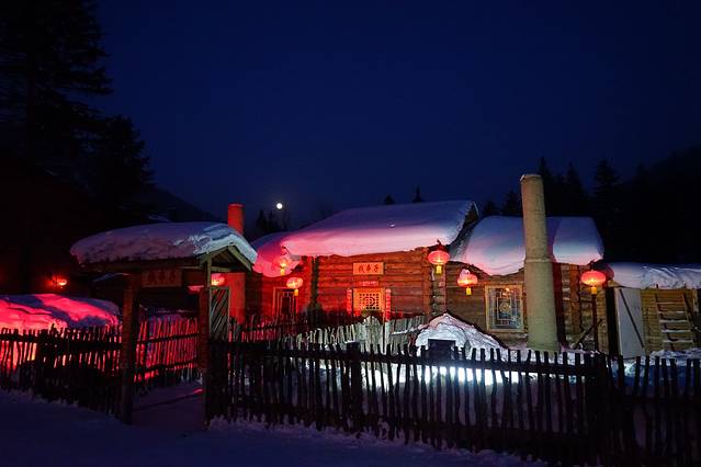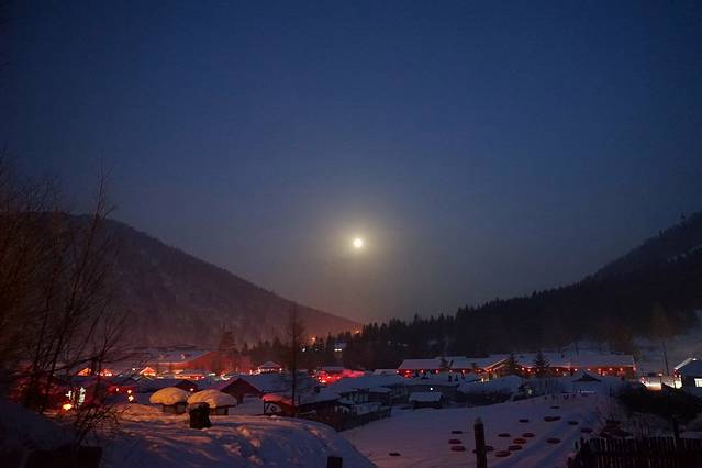 如果要拍个雪乡全景的话,确实比较难找地方,有一个最好的点,但被人承包了,要收门票380元,这个确实太贵了,受不了,我是到了随便一处的小山坡上拍的这张夜景,没带三角架去,手持拍的,所以效果一般了。