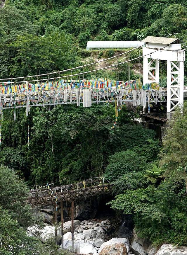 山谷中的两重索桥。
