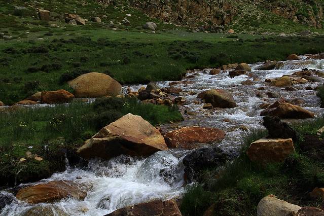 接下来又是一段颠簸的搓板路。师傅说前边就是牧区了,远处还有军营,也能看得见雪山。果然,从一小段山谷中穿出后,视线一下就开阔了,我们先是看到了一个小湖泊,下车照相的时候问师傅这叫什么湖,师傅说,这就是下雨的积水= =,于是我们就惊了。