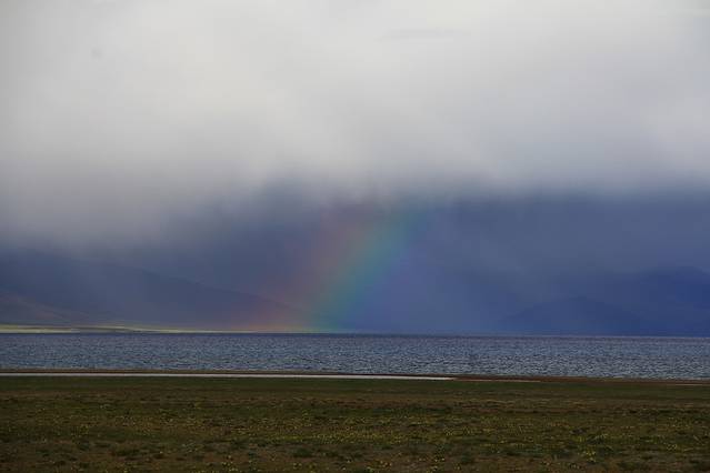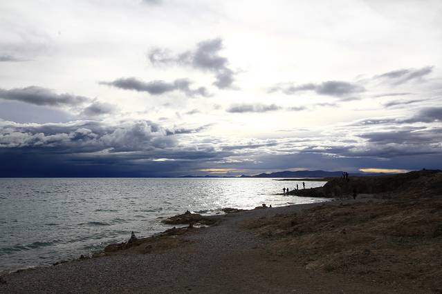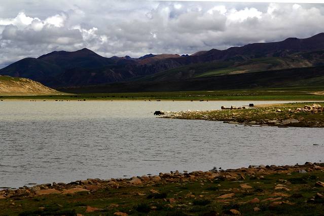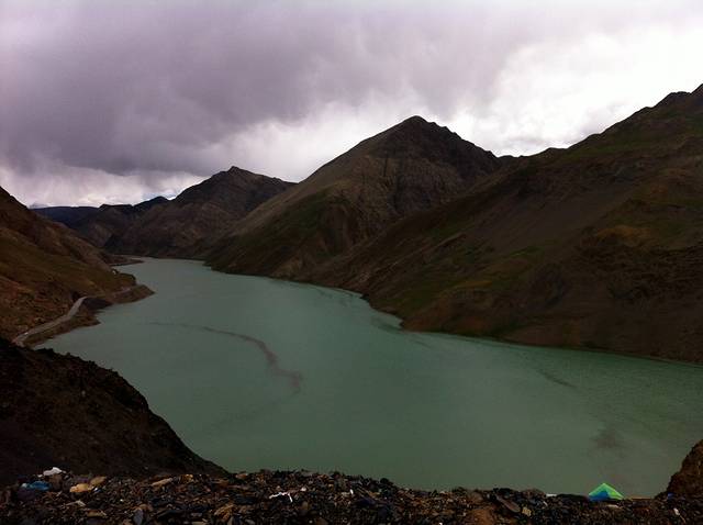 可以看的到远处的乌云。能感觉到这里要是晴天,那拍出来一定非常不错。这里的水是绿色的,而羊卓雍错的水是蓝色的,我也说不明为什么。我们说起这个问题的时候,司机师傅告诉我们,越往西走,水的颜色越深,到了阿里的神山圣湖,那的水是蓝到接近黑色的(好想看!!快带我去!)。