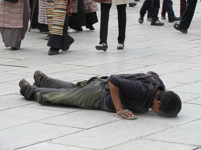 朝拜的人,他们从山中来,两天的车程磕长头要磕半年时间。