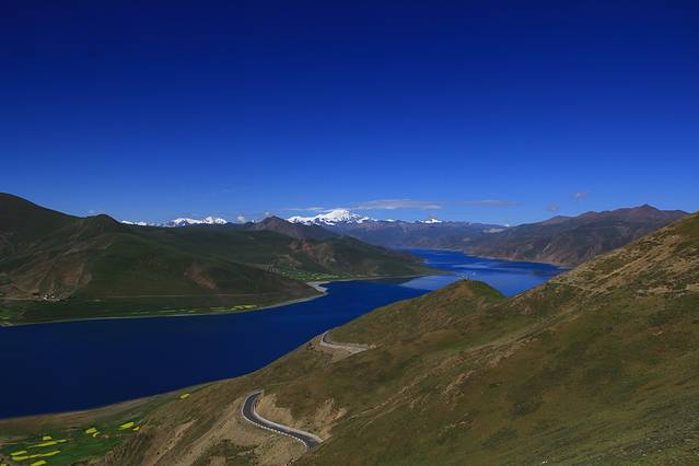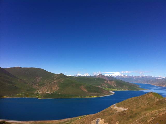 如果不是亲眼看到,我真心不相信果真存在这么蓝的湖水,可能也跟大晴天有关系,反正当时是被彻底的震撼了,顿时也体会了之前在盗笔里看到的那些“是一种下跪的冲动”是什么感觉。 看远处有雪山。