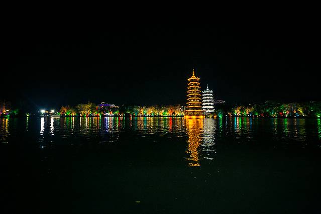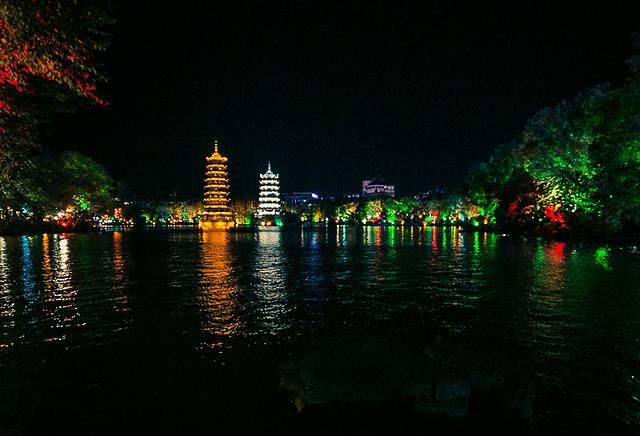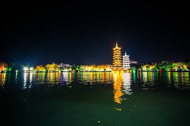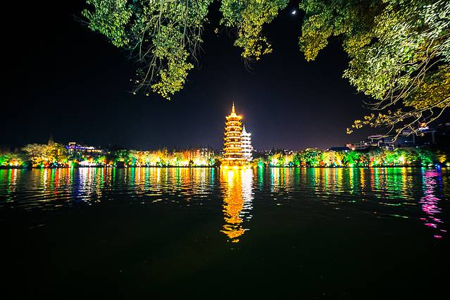 日月双塔:又称金塔银塔、情侣塔。日月双塔坐落在桂林市美丽的杉湖中,号称世界第一铜塔。日塔为铜塔,位于湖中心,高41米,共9层,月塔为琉璃塔,高35米,共7层。两塔之间以湖底一条10米长的湖底隧道相连。建成于2002年,是在唐代佛塔基础上于2001年重建的,地处桂林市中心区,坐落在桂林城的中轴线、桂林杉湖岛上,与“象山水月”相邻。
