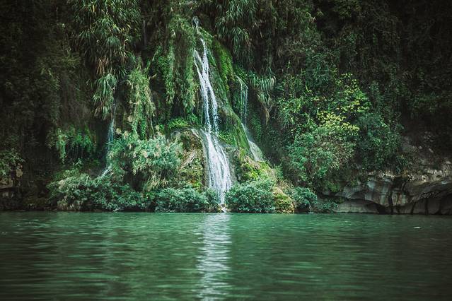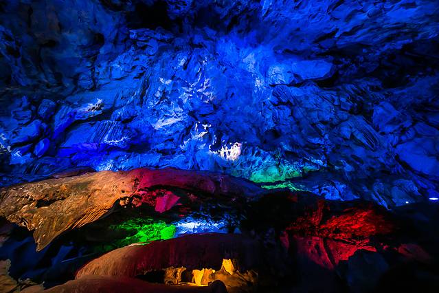 乘坐世界上最长的观光滑道直达洞内200米处,瞬间从秀美田园风光进入神秘幽深古洞宛如穿越时光隧道,由此展开了让人期待的冠岩溶洞探秘旅程。步行走过三花酒窖藏地,乘坐小火车飞跃光怪陆离的地下峡谷,经历温度骤降来到气势恢宏的“热带雨林”棕榈大厅。之后步行下阶梯,进入地下河码头,乘小木船进入“盗墓笔记”的暗河水道,700米的游程沉浸在若明若暗、神秘莫测的幻境之中。上岸之后,还有'天窗、瀑布、金羽琴、嫩雪石'等岩溶奇观。随着水声慢慢亲近“世界溶洞最大瀑布”,不过这次并不凑巧恰逢瀑布封闭参观。至此游览结束,可乘坐30多米高的观光电梯走出洞口。