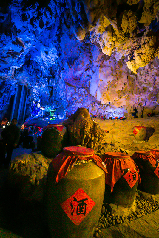③ 溶洞藏酒:旱洞里辟有一处酒窖,洞藏着与桂林辣椒酱、桂林豆腐乳并称为“桂林三宝”的三花酒。由于洞中冬暖夏凉,常年温度保持在19℃-20℃,湿度在90%以上,由于临江,洞内保持了一定的湿度。洞藏酒窖恒温恒湿的环境特别适合酒的陈放和老熟,有“洞中方一日,世间已千年”的效果。据说早从唐代开始,当地人就一直把溶洞当作三花酒的天然酒窖。三花酒经洞内贮藏,老熟后,醇净绵甜,乃酒中珍品。