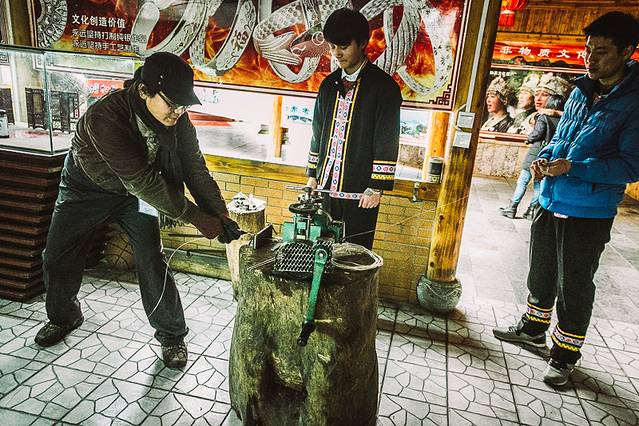 錾 zàn 花:某一件工艺品初具大形并铸入支撑物后,在其上进行手工錾刻的过程称为錾花。錾花在整个工艺品形成的过程中是一个最重要的部分。一根根细细的丝线,在小伙子们的手里经过数道工序,就变成了一件件精美的工艺品。大银工坊的手工艺始终保持着手工雕制的原始性,维护着银质与史俱来的个性特征。