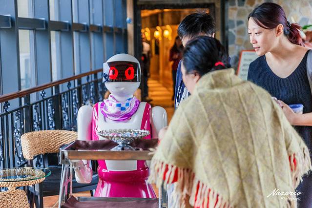 这里最有特色的是有位自动送餐的美女机器人,枚红色的围裙,紫色的丝巾,小丫忍不住要给个大大的拥抱!