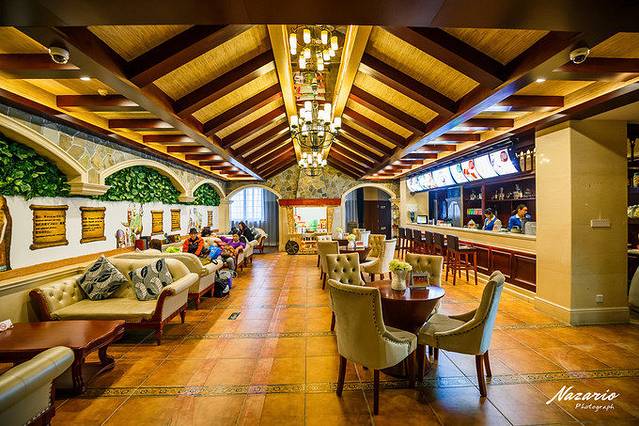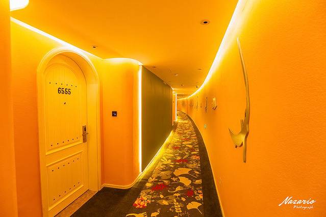 酒店如一座欧式童话城堡。走入城堡中,从门厅到过道,从餐厅到中心水景,甚至电梯内,都随处可见恐龙元素,随时随地都能与恐龙们合个影,堪称酒店中的迪士尼!