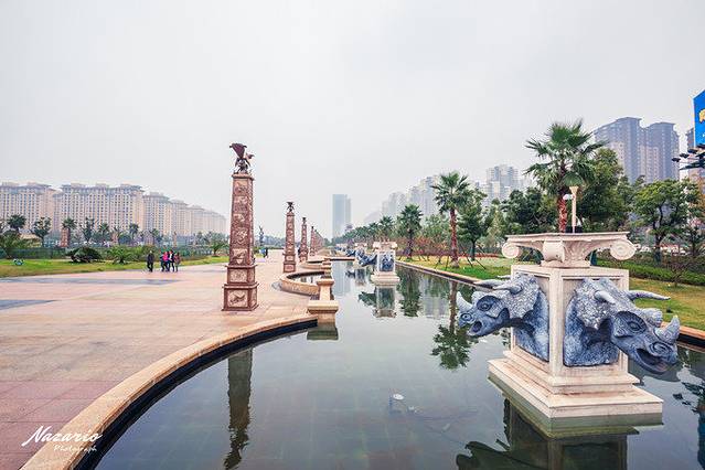 湖对面的大型建筑就是中华恐龙馆,中心的湖区也满是恐龙造型的雕塑!