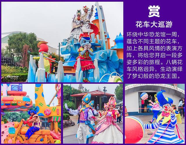 从每天下午开始,环绕园里的核心建筑——中华恐龙馆一周,游客可在路两边观看。蕴含不同主题的花车,加上各具风情的表演方阵,将给您开启一段多姿多彩的旅程。八辆花车风格迥异,生动演绎了梦幻般的恐龙王国:“峡谷卫士”英勇威猛,“神秘雨林”魔幻多姿,“欢乐海洋”时尚愉悦,“明日世界”亦真亦幻,“摩登鲁布拉”与众不同,“梦幻王国”妙趣横生,“风情鲁布拉”婀娜婉约,“美丽鱼车”灵动可人。现场还有彪悍健硕的恐龙卫士、玩轮滑的海草哥哥、妩媚的森林妖精与游客互动,整场巡游藏着很多令人惊奇的地方。