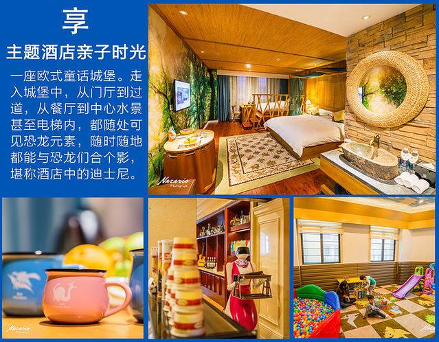如一座欧式童话城堡。走入城堡中,从门厅到过道,从餐厅到中心水景,甚至电梯内,都随处可见恐龙元素,随时随地都能与恐龙们合个影,堪称酒店中的迪士尼!我们预定的是“森林木屋”家庭主题套房,恐龙主题酒店共有六大主题房,主题房间具备50-60㎡超大空间,或奇趣、或魔幻、或浪漫,汇集亲子房、度假房情侣房等多种房型供选择