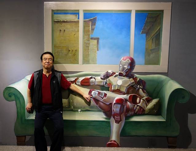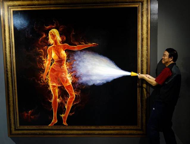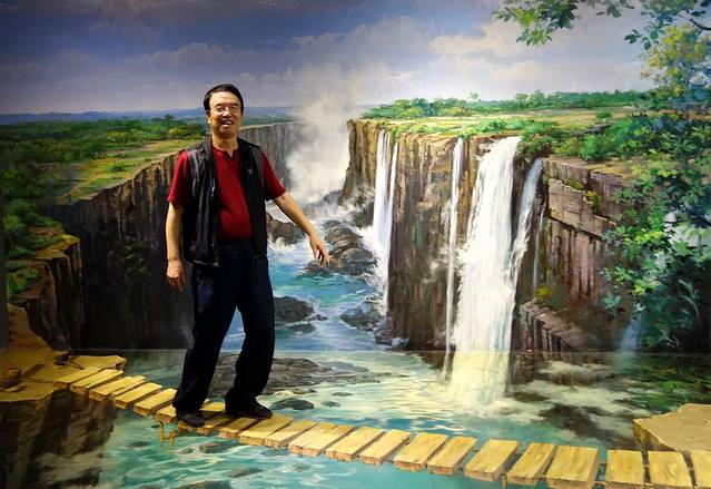 所谓奇幻艺术,实际上就是在近年来不断受到追捧的三维街头地画、城市三维立体画等艺术形式上发展起来的。画家直接以地面和墙壁为载体进行油画创作,利用平面透视的原理,制造出视觉上的虚拟立体效果,令参观者仿佛走入生动逼真的三维空间之中。同样,也可以运用特殊透视法,令二维平面展现三维效果的同时,让“远近”“高低”“大小”等比例关系发生奇妙错乱。让参观者产生强烈的参与欲望和趣味。