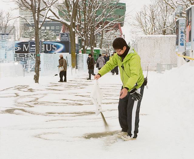 因为人流量大 路面的雪很容易被踩实 所以工作人员需要经常把黑沙洒在路上以达到防滑的目的