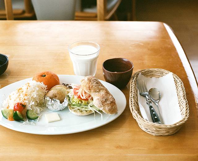 早餐时烤土豆 三明治 沙拉 水果 牛奶还有小酸奶