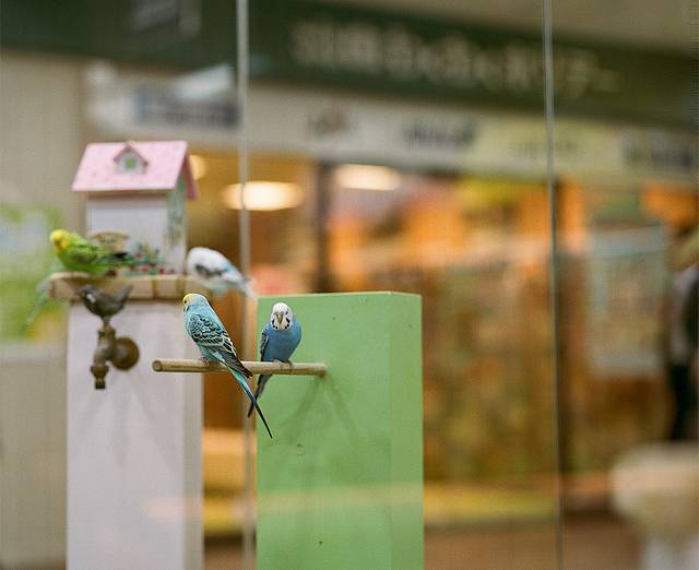 地下街宠物店把鹦鹉放在了街中的玻璃箱子中 颜色特别可爱 成了一道地下街景