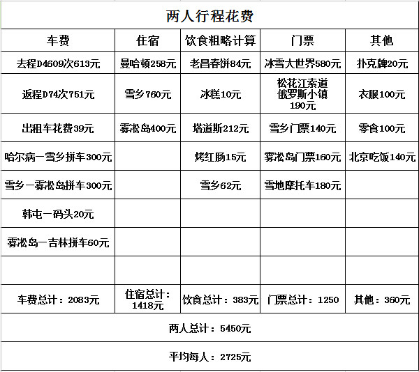 关于拼车,拼车哈尔滨—雪乡是在卡兹国际青旅订的,费用为150元/人,哈尔滨—雪乡的拼车不是很愉快,原本说的是哈尔滨到雪乡时间大约5、6个小时,也就是说7点出发然后中午的时候也差不多就能到了,结果司机开的是一个30人左右的中巴,先把其他人送到雪谷,然后又翻回雪乡,这样时间一共用了9个半小时才到达雪乡,弄的很是不爽,在到雪谷的时候给卡兹的那个司机打电话,还算客气的解释,想想也就算了吧。虽然雪谷离雪乡很近,穿越过去的话只有16公里左右,不过穿越路线是走不了车的,雪谷在山的背面,而雪乡在山的阳面,所以坐车过去的话相当于翻过一座山的距离,在这里其他小伙伴们还是注意一下好。 雪乡—雾凇岛的拼车也是卡兹订的,只不过不是一个司机开车,这个司机是雾凇岛的本地人,同时在当地开设住宿,小飞师傅的车是一个7座的商务,从雪乡开到雾凇岛只用了4个多小时,技术还是很稳当的,人也不错,这里推荐下。如需要拼车联系方式的私信我,(为避免广告嫌弃). 费用同样是150元/人。