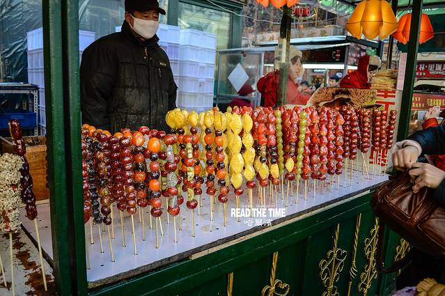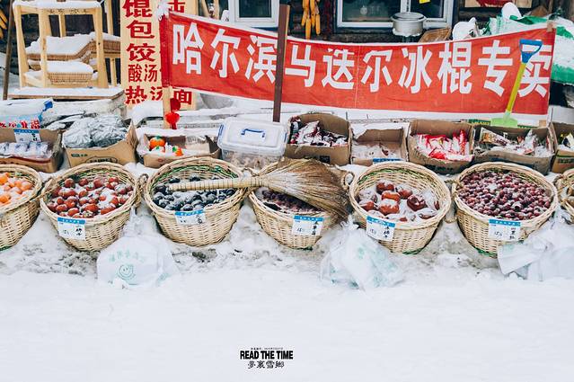 各式各样的冰糖葫芦,我觉得只有在哈尔滨才能吃到真正的“冰”糖葫芦,因为天气寒冷,水果里面结成冰渣,这凉爽。