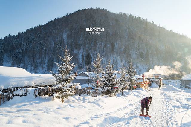 经过昨日一场大雪后,雪乡的雪更加厚了起来,当地的人在清理路上的积雪。