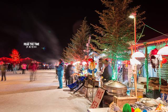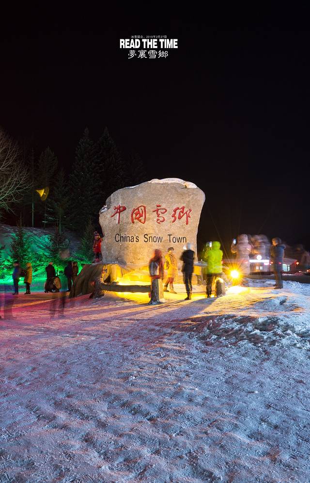 雪乡的石碑,在此少不了游客驻留拍照留念,有个孩儿妈拿着个中端单反拍照问我拍出的片子怎么都是黑的,我拿过来看了一下,档位是在M档,光圈收的太小了,再加上晚上进光不够也就可想而知了。。。