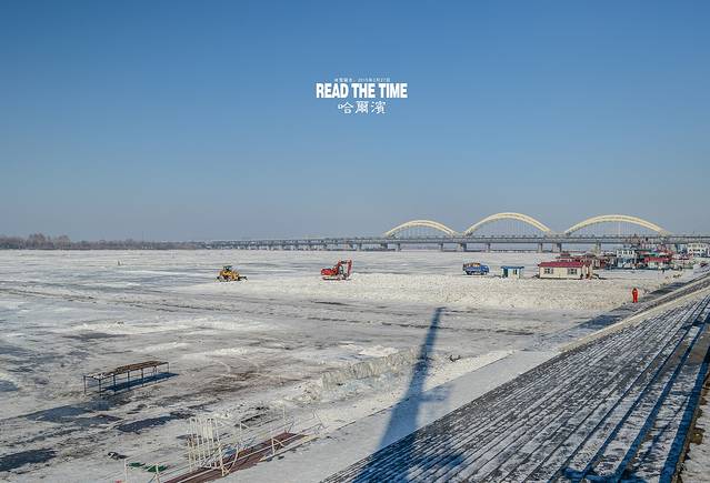冰冻三尺非一日之寒。照片可以看出松花江的冰还是很厚的,上面可以走车,就连挖掘机的重量也丝毫不是问题。