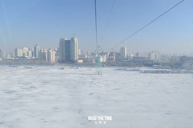 买了两张松花江往返索道外加俄罗斯小镇的套票,在宽有1500多米的松花江上远盼后面的哈尔滨道里区。