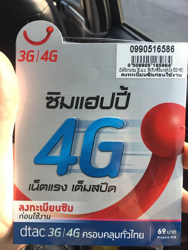 dtac专营店,还是在商场的一层,星巴克旁边,服务员推荐的不是平时淘宝卖得较多的happy卡(7天299b,1.5G,7-11有售)。而是另外一种4G卡,2.5G,299b,但有69b卡费,还有税费共计389b/张,需要出示护照。工作人员帮忙把买的两张卡都开好设置好,这样就可以直接插进老公手机里去用啦,无需再自己设置。
