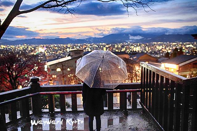 黄昏时分,在京都的清水寺-非常独特的视角,可以俯瞰京都全城,刚下过小雨的京都,空气中弥漫着一股清新的气息,近处是日本古都的灯火阑珊和熙熙攘攘的街景,而远处是群山和晚霞,半山腰上环绕着的似乎是雾气,又似乎是云朵