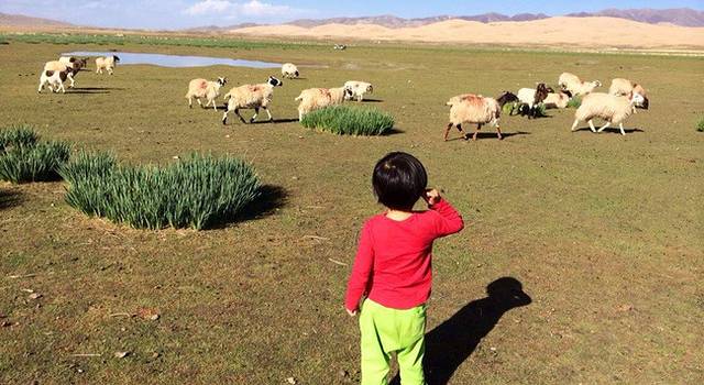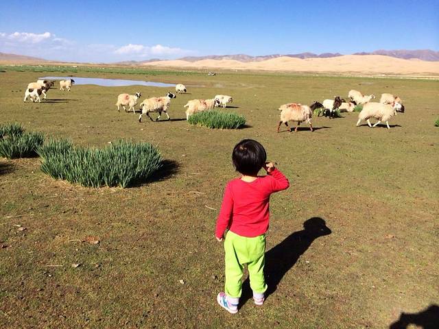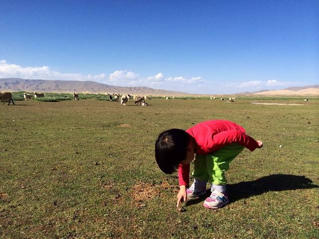 娃下车,羊群已奔入草原,娃失望极了!牧民伯伯盛情邀请娃到自己的马背上照相,望着颠颠跑远的羊,娃凑合骑了一下马,下来执着的追羊,顺便找找蚂蚁的家,观察蚂蚁搬运受伤的同伴,辨认地上的便便。折腾一番后娃激活了。