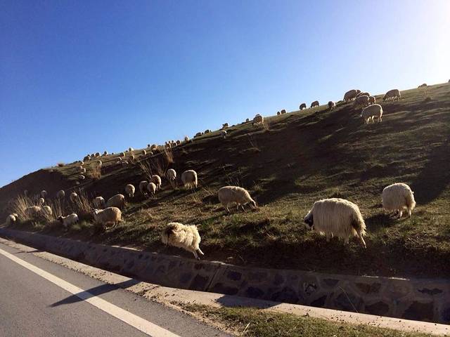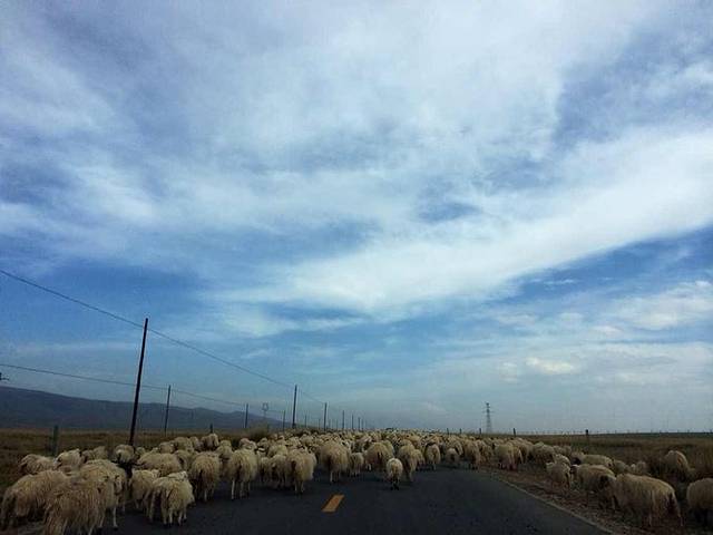 娃刚醒,还迷瞪着呢,一大群羊在路上蹓跶。麻麻提示娃数次皆没反应,感情还梦着呐。牧民伯伯抓住了一只掉队的羊,友善的抱到前车聪聪哥哥面前让他摸,麻麻叫娃:伯伯抱着羊咩咩,要不要让宝贝也抱一下。娃激动万分:我要抱羊咩咩!