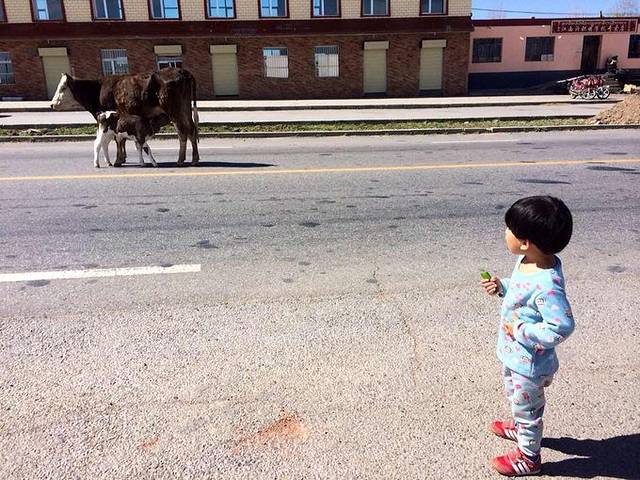 江西沟镇上牛群当街散步,娃大喊停车。远远的看着牛宝宝在路中央喝奶,开心的跟它们打招呼,给它们扔糖吃提醒它们注意安全。路边不时有大货车呼啸而过,麻麻提醒娃前面有更多羊咩咩想吃糖。娃不情愿滴上车,还说:麻麻,牛妈妈和宝宝吃了我的糖吗?
