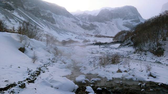 魔界风景区位于长白山北麓,距长白山北景区山门35公里,邻近二道白河镇。“魔界”的水系是长白山天池流泻而下的温泉水,常年不结冰,每到冬季,当气温达零下20摄氏度时,雾气蒸腾,出现雾凇和树挂,氤氲缭绕、天人一体、旖旎景色如仙境。清晨,树木挂满雾凇、水面或直立或横卧的枯树在飘散的浓浓雾霭中若隐若现,变幻莫测,玉树琼枝、远山近水相映成趣,呈现出不啻天空之镜。当天气晴朗日出时,阳光从雾里透过树挂晶莹剔透,整个场面分外妖娆,水面的枯树、岸边的雾淞与喷薄而出的红日和蒸腾飘渺的雾气交融在一起,便形成了一幅幅奇丽绝美的画面,立于岸边,幽深雅静、神秘迷人,眺望远方,仿佛置身于亦真亦幻的魔地,远离了尘世,远离了喧嚣,走进了一个远古的神奇的魔幻世界。