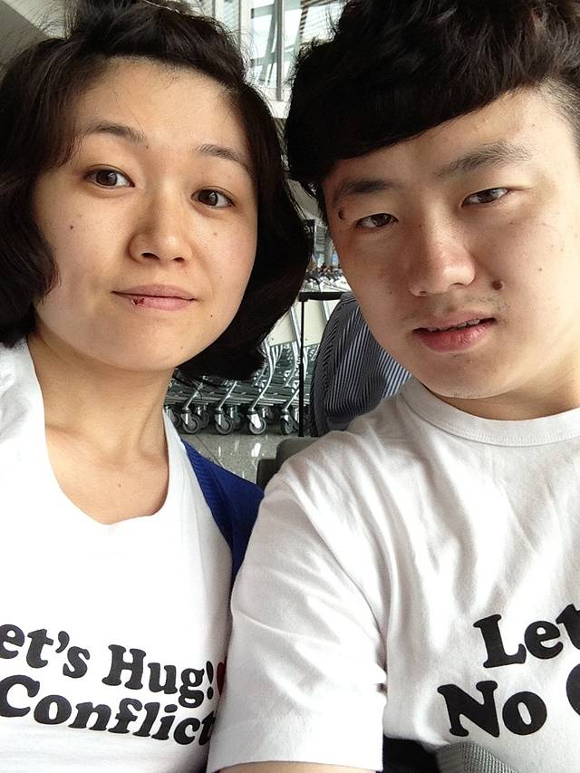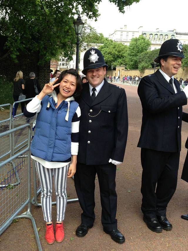 等待时间就是和白胖儿警官合照,由于他有荷枪实弹的装备,所以合照的时候他说:“I can't touch u.”