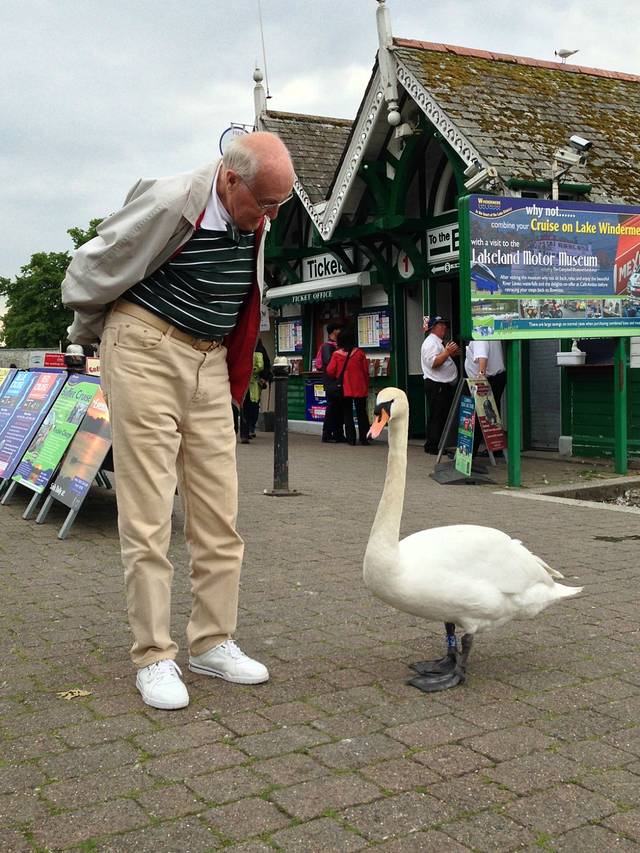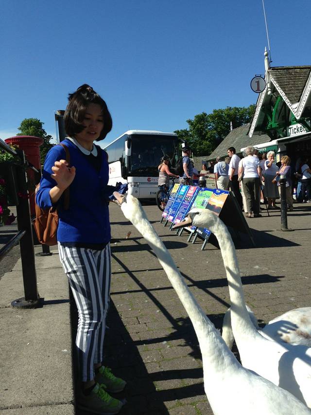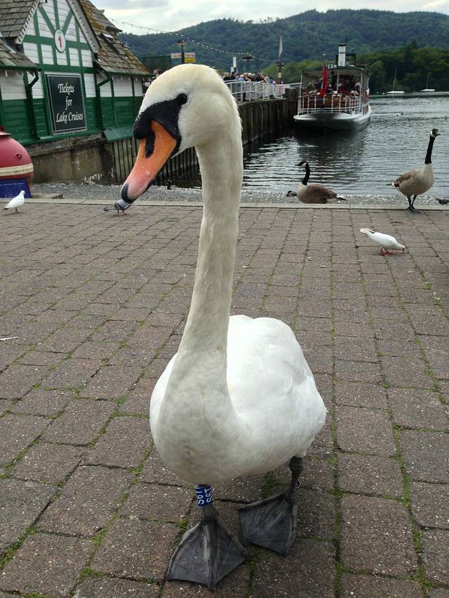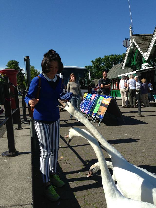 我每天都要来Bowness喂白天鹅,这样已经红嘴的是成年的,黑嘴的是还是正在蜕变的丑小鸭,但是他们才不会爱幼,要是食物被偷吃了,就一直哆哆哆的咬小黑嘴。看那小圆眼睛就这么看着你!