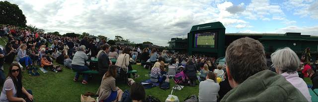 温布尔登网球公开赛第一天,四大满贯赛事不用多说啦,冲他才把最后一周全部安排在了伦敦。温网的排票是出了名了,幽默的大爷总说这是The Best British Queen,大家坐地铁从Southfield下车,走到Park 10去排票,基本上你要不是前天就来搭帐篷等第二天的票,或者早上4点就到这,基本上是就得下午5点以后才能进去了,因为球场内的容纳人数是一定的,满了之后,需要出去多少人,才能进入多少人。不过不要慌,一般大牌种子选手都会安排在Center Court的最后一个登场,基本上就是5点以后了。第1天排的是1万多号,5点以后进去,Murrey才刚开始,Nadal还在打,只不过一会儿就被一记Ace球打出局了。第2次排的是8千多号,5点左右进去的,Fedder还没打呢。所以大家就当是温网是郊游来了,野餐聚会。对了,进Ground的门票是每人21磅,如果要看Center Court或者Court1或者2的都要另付费,53磅起,越往后越贵。