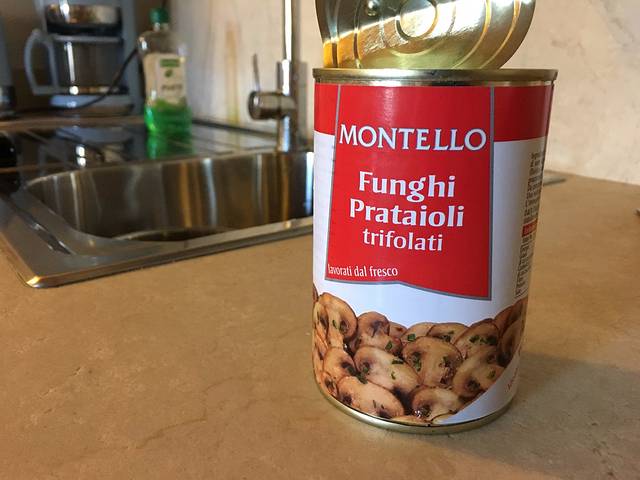 超市很小,基本上只能买到些基本的蔬菜,和非常好吃的牛肉。当然自己烧饭离不开要有油盐酱醋,这里说下买油,去超市可以买下面这种蘑菇罐头,自带很多蘑菇油,可以烧好几顿,里面的蘑菇又可以拿来炒菜,非常方便。
