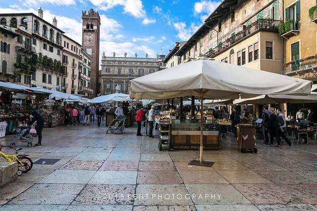这里是相对我比较喜欢的维罗纳景点,大概也跟傍晚天气好一点有关系。集市上人纷纷攘攘,随处可见非常义乌小商品市场特色的小玩意,只是T恤上的字换成了意大利文。广场上人没有那么多,如果有时间可以坐下来喝杯东西,慢慢品位这座城市的韵味,只是别喝太多,厕所真不好找。