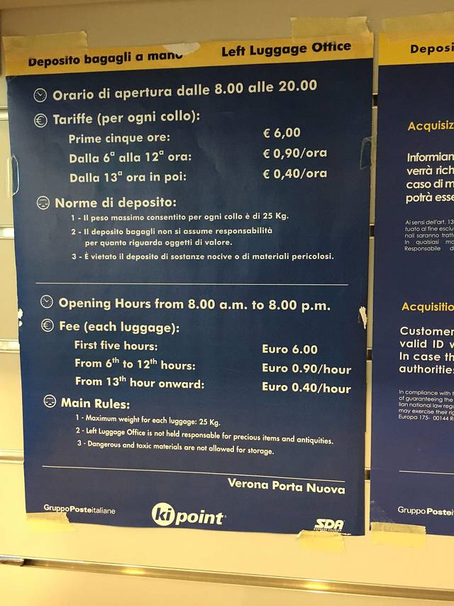 维罗纳的火车站下车以后就是汽车站,这里提一下维罗纳火车站的厕所竟然是要收费的,0.7欧元一人,所以提前在火车上解决完吧。然后火车站有麦当劳,也有可以存放行李的地方,只是价格比较贵,前5个小时每件行李6欧元,是每件!不管你是大包还是一个手提包都是6欧元,所以能并在一起尽量一个包吧。