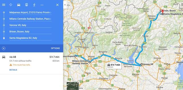 第二段:米兰到Bressanone。这段全程火车,需要倒4次:米兰机场(Malpensa Aeroporto)->米兰中央火车站(Milano Centrale)->维罗纳(Verona Porta Nuova)->布列瑟农 (Bresssanone Brixen)-> 博尔扎诺(Santa Magdalena),全程400多公里。