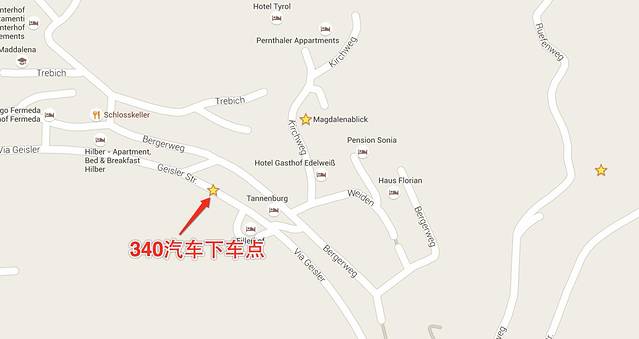 车票可以上车买,3.5欧一个人,最好提前准备好零钱。车是黄色的,全程大概30分钟,途中景色非常美,会进入一个山谷的小路,然后一路是牛羊遍地,木屋炊烟袅袅,感觉进入了室外桃园。下车地点需要根据所预定的酒店地址来选择,推荐看下谷歌地图结合时刻表的时刻来选择,否则早下或者晚下都比较痛苦,需要拖着行李在有坡度的山路上还是比较累的。这里我把我下车的地点标记一下,基本算是小镇中心的下车点。
