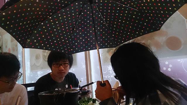 早上还艳阳高照的,中午吃饭吃到一半下起了暴雨,坐在窗边的我们撑起伞吃起了饭。