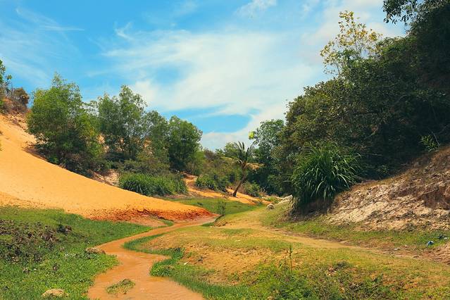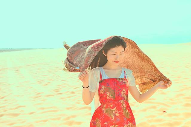 之前是听说门口的人帮你看鞋子要付5000越南盾,现在好像是进去就要付,脱了鞋踩在软软的沙子上溪水不停地流很舒服呢不过要注意小石子和深坑,但是太阳真心大,走到一个小沙坡,和小伙伴脑子搭住了以为上面视野会很好赤脚爬上沙滩,大家可以想想正午下面的沙子有多烫嘛!!简直不能忍,感觉都不是自己的脚了