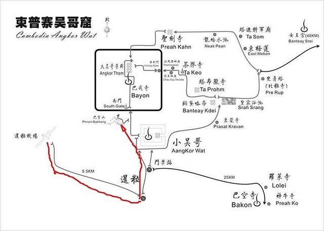 小圈:小吴哥日出-周萨神庙(ChauSayThevoda)—塔玛侬庙(Tamanon)—塔高庙(Takeo)—塔布龙寺(TaProhm)—班蝶克雷庙(BanteayKdei)—皇家浴池(SrasSrong)(Kravan)克罗凡庙,—小吴哥(AngkorWat)(世界七大奇景)—巴肯山爬山日落(BakhengMountainseesunset)