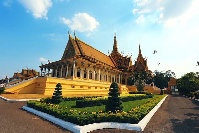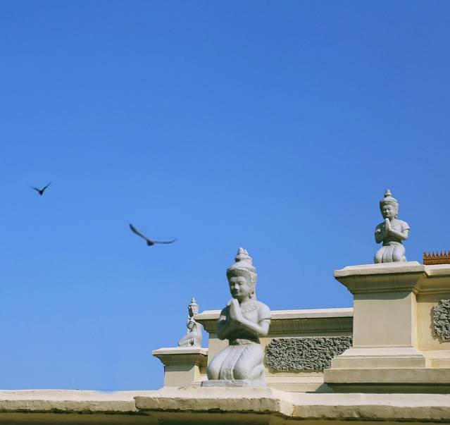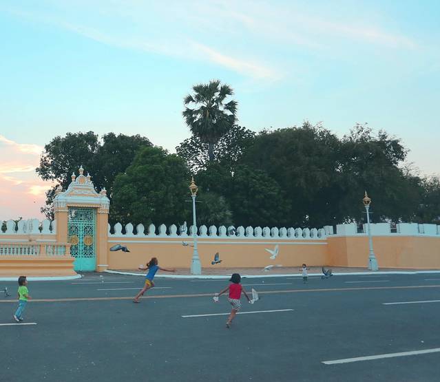 早上7点的车启程柬埔寨。开到柬越边境大概3个多小时,过关大概45分钟。之后再开2个小时左右。一共6小时左右吧。金边这个城市感觉蛮空旷的,没什么人,马路也很宽敞。到了柬埔寨就看不大到出租车了,满街的突突车。下午叫了旅馆门口的突突车去王宫和银殿。3美元。好看是蛮好看的,但是都不让进的,只能在外围看看。王宫门口有很多很多鸽子