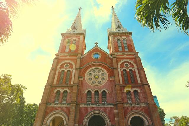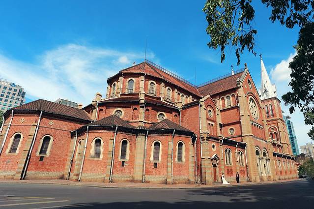 出了统一宫过条马路就能看到教堂,只看过上海那些小教堂的人表示红教堂好看死了!有很多拍婚纱照的,教堂中午也不开的,好像要下午3点才开